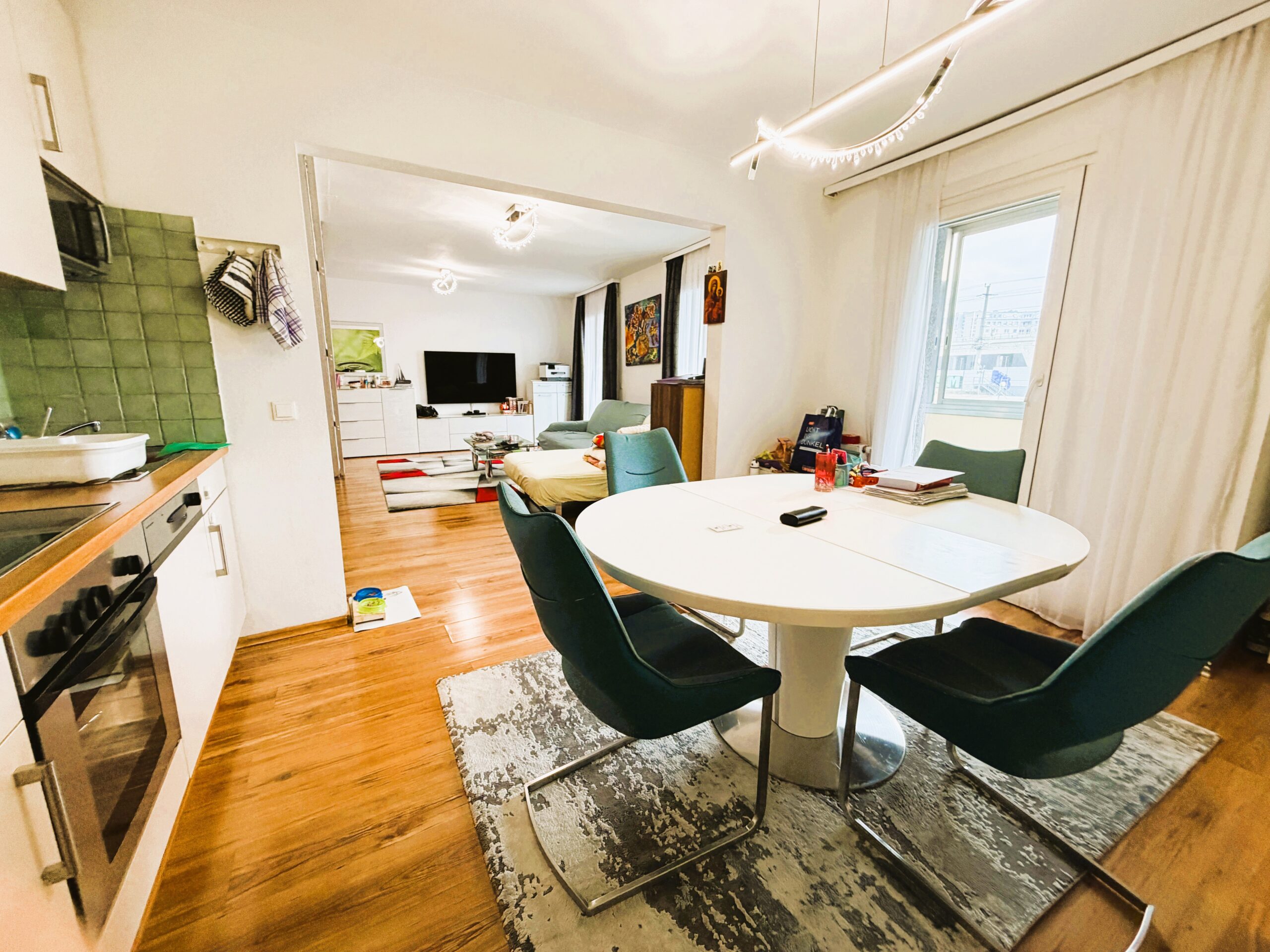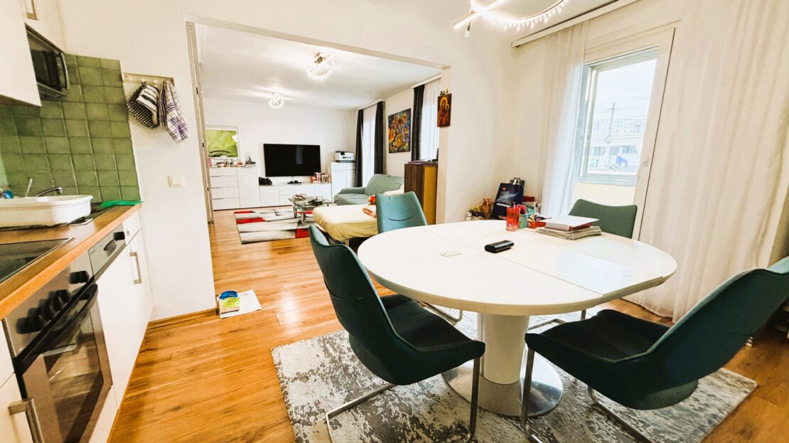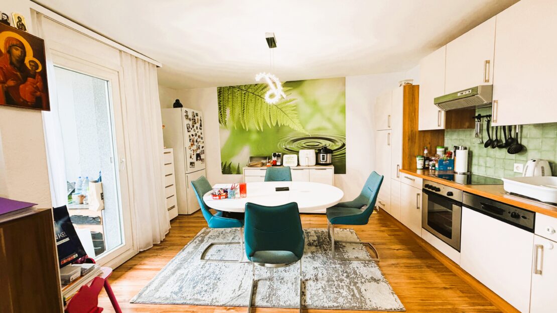 Das Herzstück der Wohnung ist die beeindruckende Wohnküche mit rund 42 m², die durch ihre Offenheit und Großzügigkeit ein einzigartiges Raumgefühl vermittelt. Großzügige Glasflächen sorgen für ein lichtdurchflutetes Ambiente und fließende Übergänge ins Freie. Von hier aus gelangen Sie direkt auf den großzügigen Balkon (rund 10 m²), der den Wohnraum harmonisch nach außen erweitert und zu entspannten Stunden im Freien einlädt.