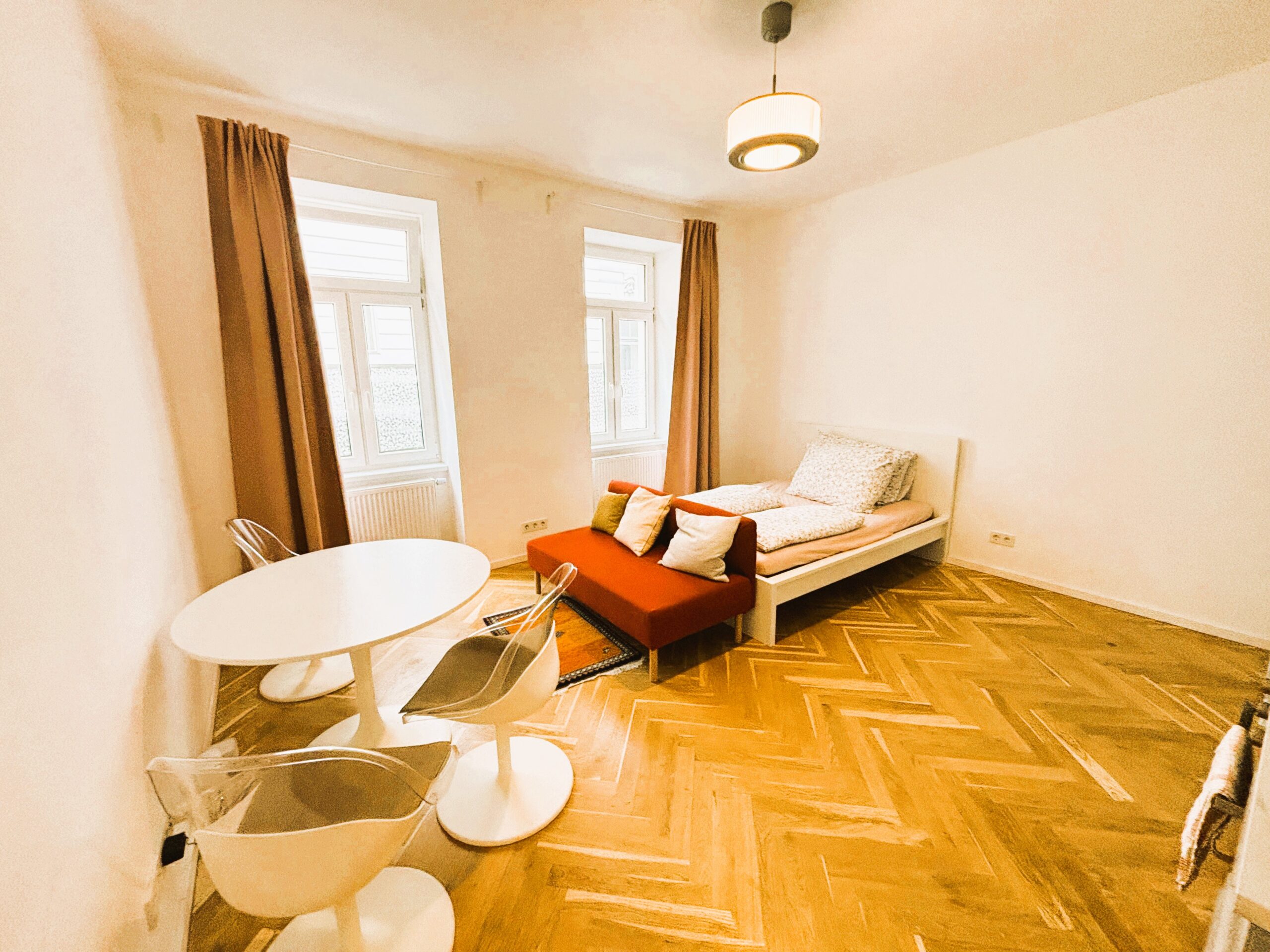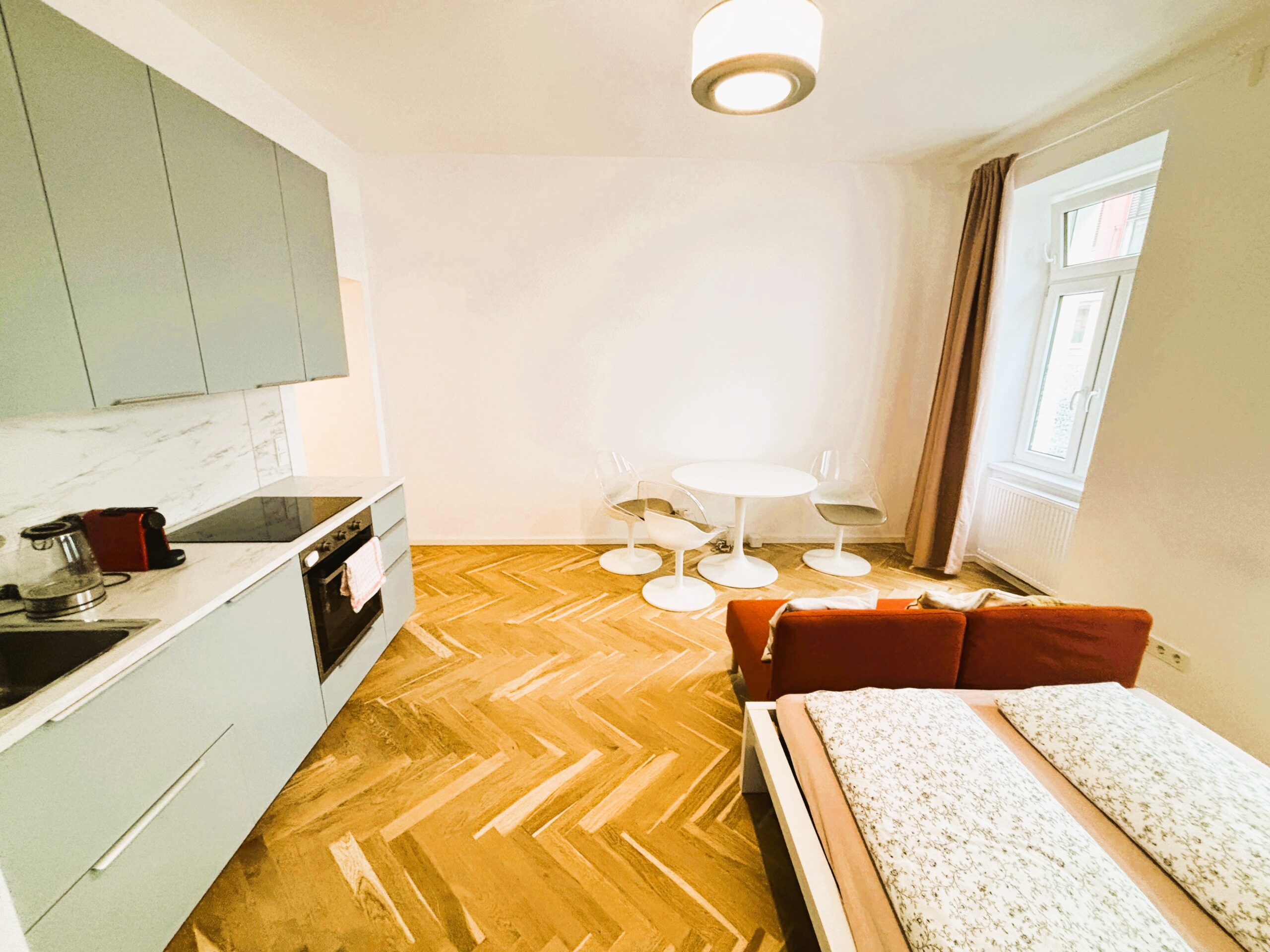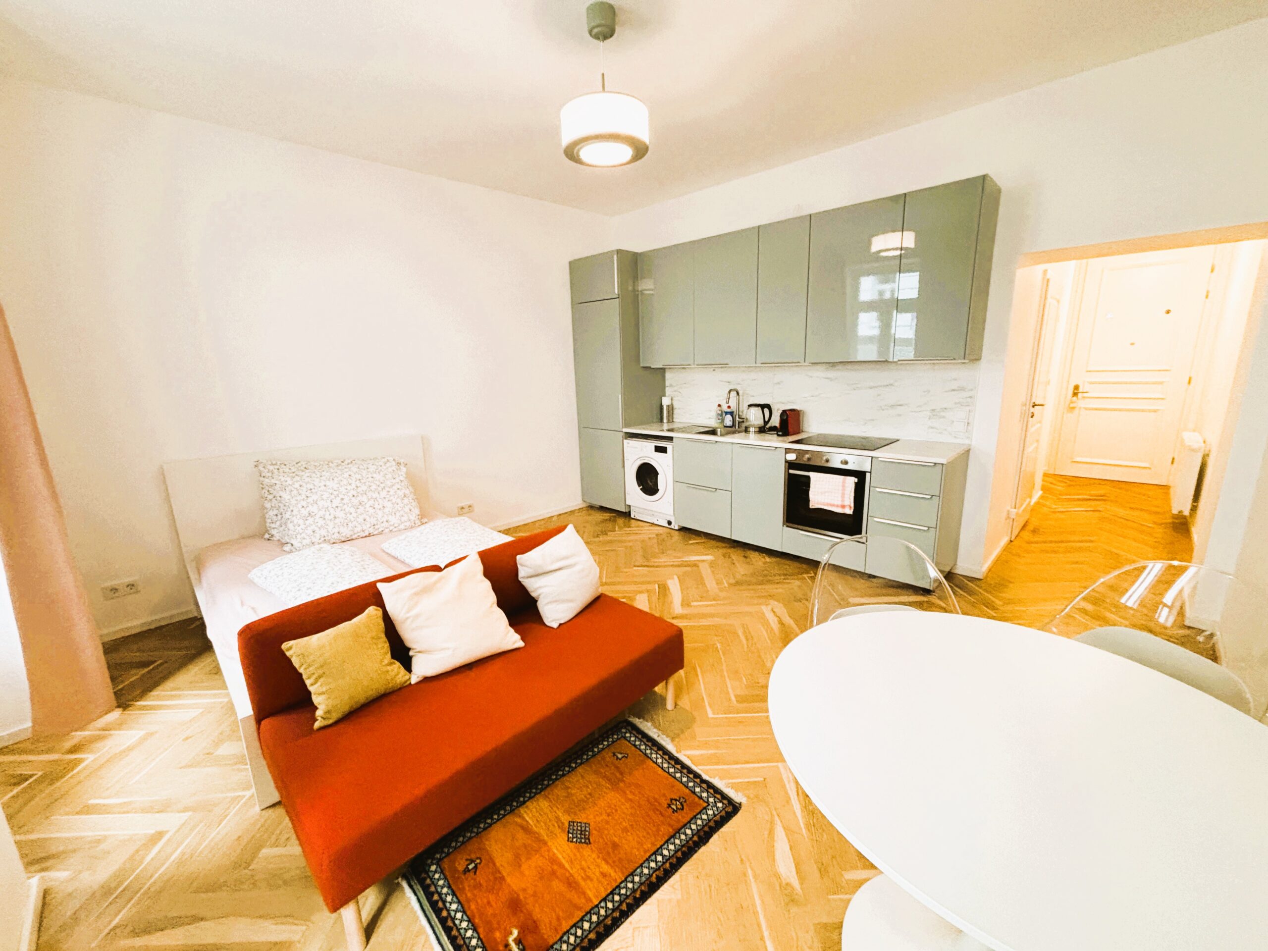 Das attraktive Altbauhaus wurde 2025 generalsaniert und die Wohnungen vollständig erneuert. Die Immobilie besticht durch eine erstklassige Infrastruktur und hervorragende Verkehrsanbindung. Die kompakte Wohnfläche von ca. 35 m² verteilt sich auf zwei Zimmer sowie ein Badezimmer mit WC. Dank der sinnvollen Raumaufteilung wirkt die Wohnung großzügig, und alle Räumlichkeiten sind zentral begehbar und separat zugänglich, geeignet für bis zu 4 Personen. Das Wohnzimmer ist mit einer neuen Einbauküche inklusive Geräte ausgestattet (Waschmaschine, Geschirrspüler, Kühlschrank mit Tiefkühlfach).